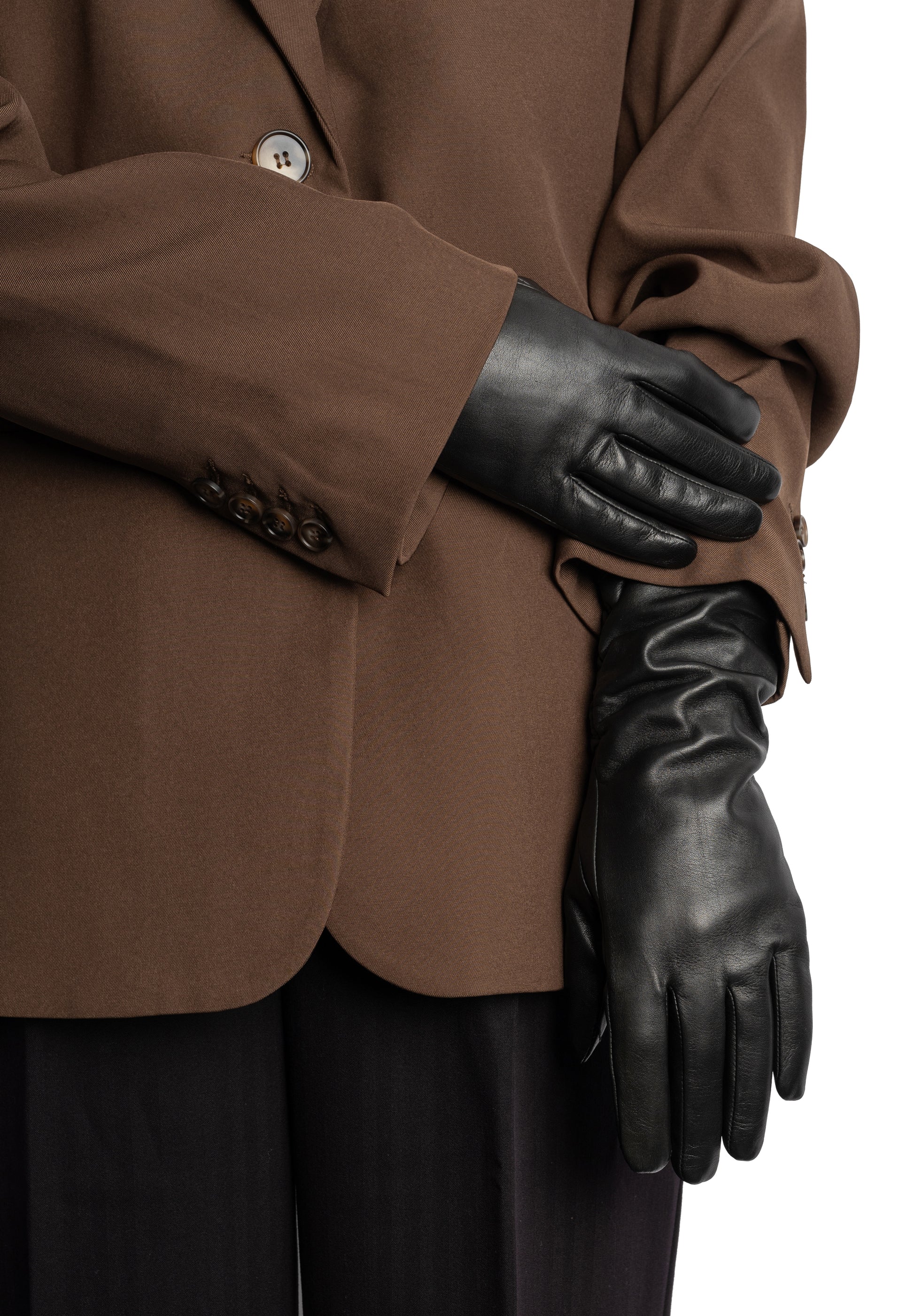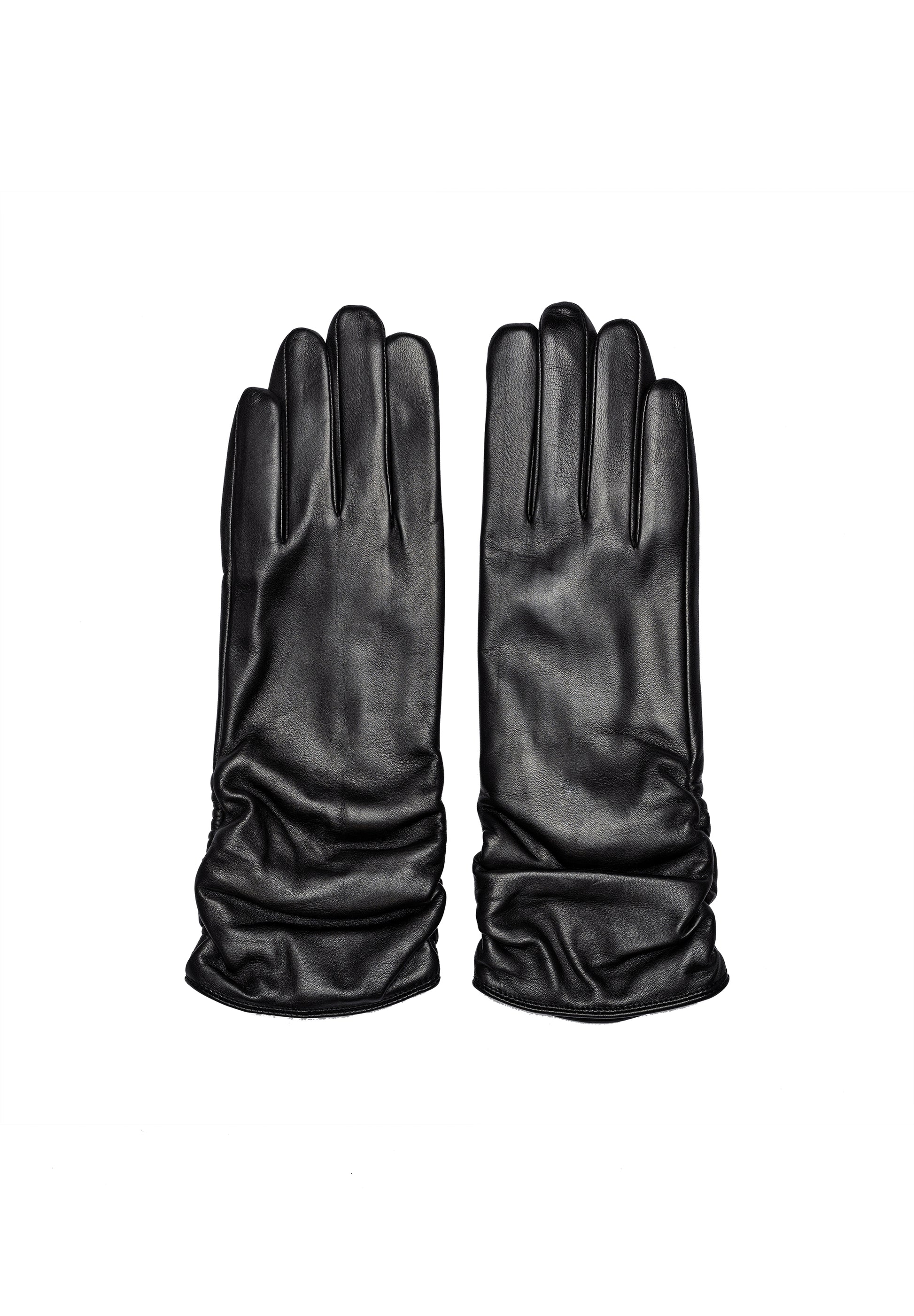 Anvi er en elegant handske i sort læder og med varmt uldfoer. Der er syet rynker i hver side for raffineret look, og den varmer godt om håndleddet. Handsken findes i tre størrelser.