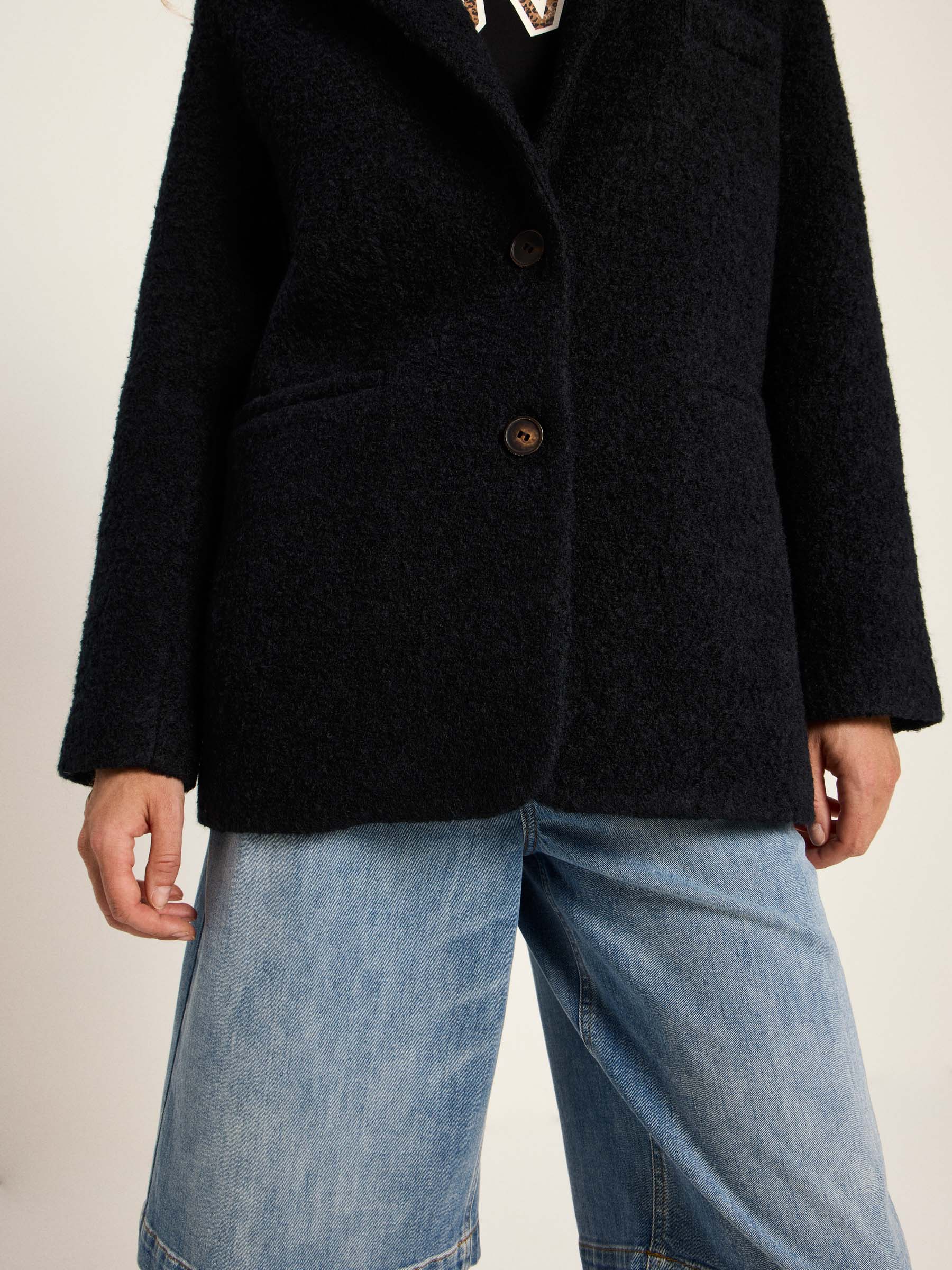 Klassisk blazer i ren økologisk boucléuld. En jakke i 100% økologisk uld som holder dig varmt og giver vinteroutfittet et trendy touch, - til dig der er træt af syntestiske jakker som ikke holder dig varm.