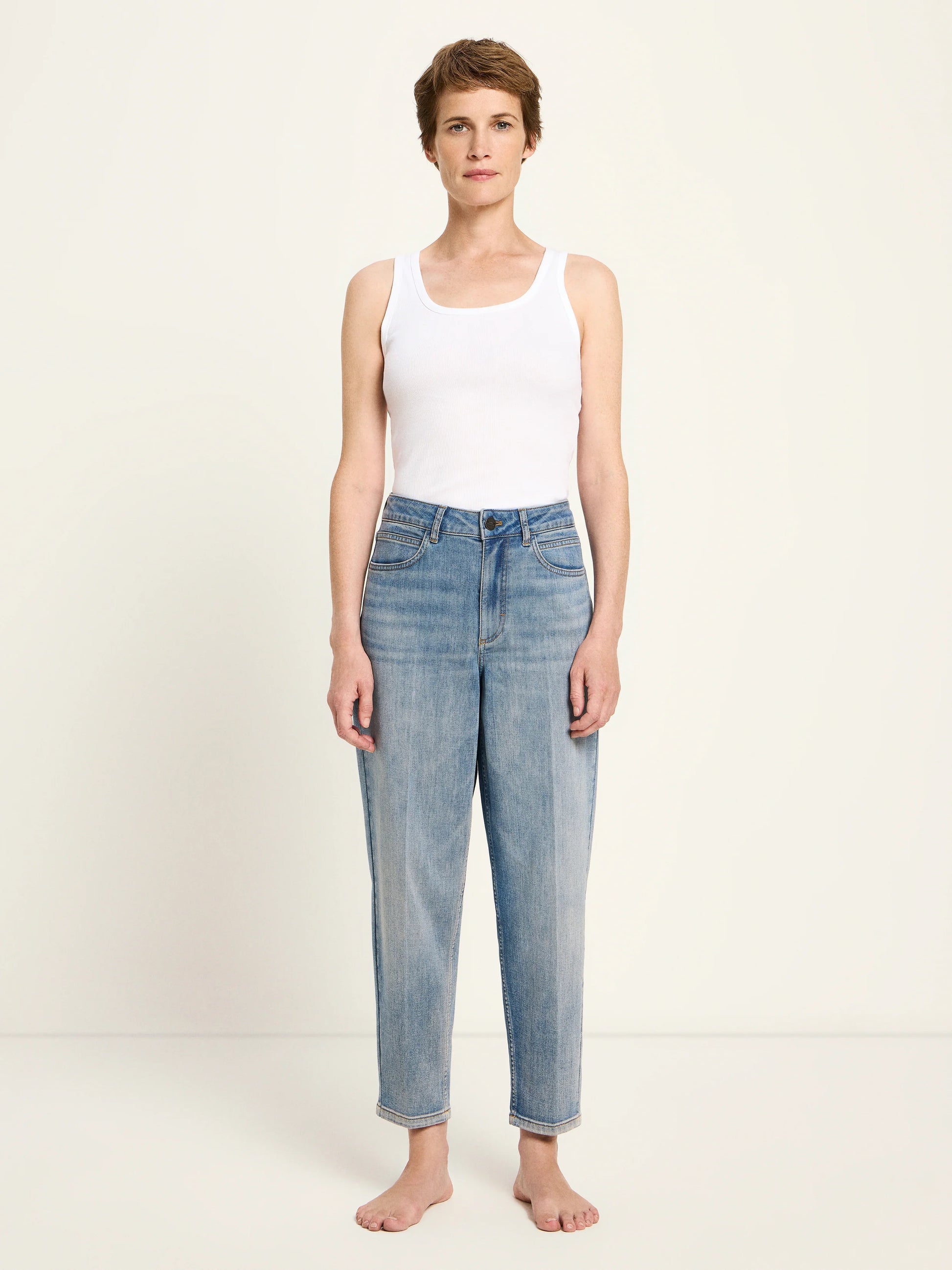 Cropped jeans i blød, økologisk bomuld som gør dem ekstra komfortable. Der er også en smule elastan, som gør buksen ekstra behagelig og tilpasser sig kroppen. Denne model har god bredde ved hofterne, og snævre ind forneden.