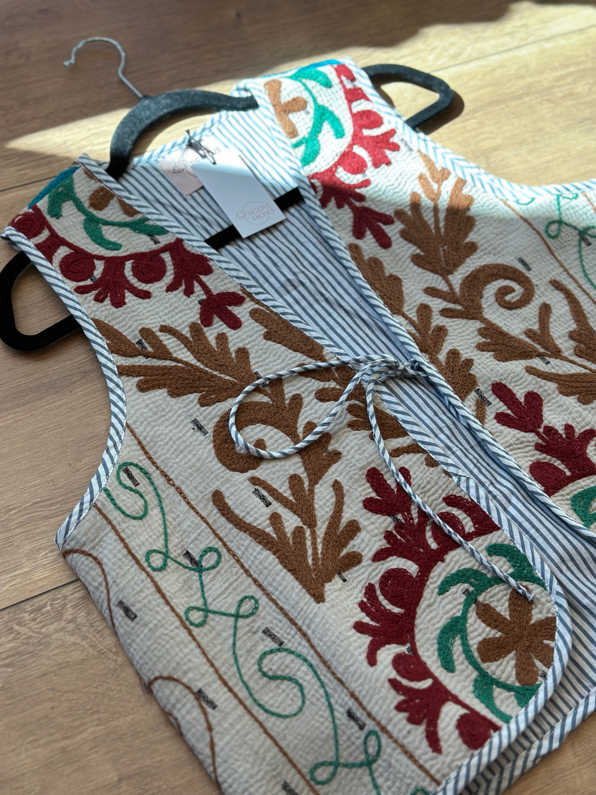 Smuk og unik vest syet af Kantha quilt med de fineste Suzani broderier. Vesten er let vatteret, og perfekt til indendørs brug hele vinterhalvåret - og udendørs i sommeren. Vesten har bindebånd foran og stribet bomuldsfoer.