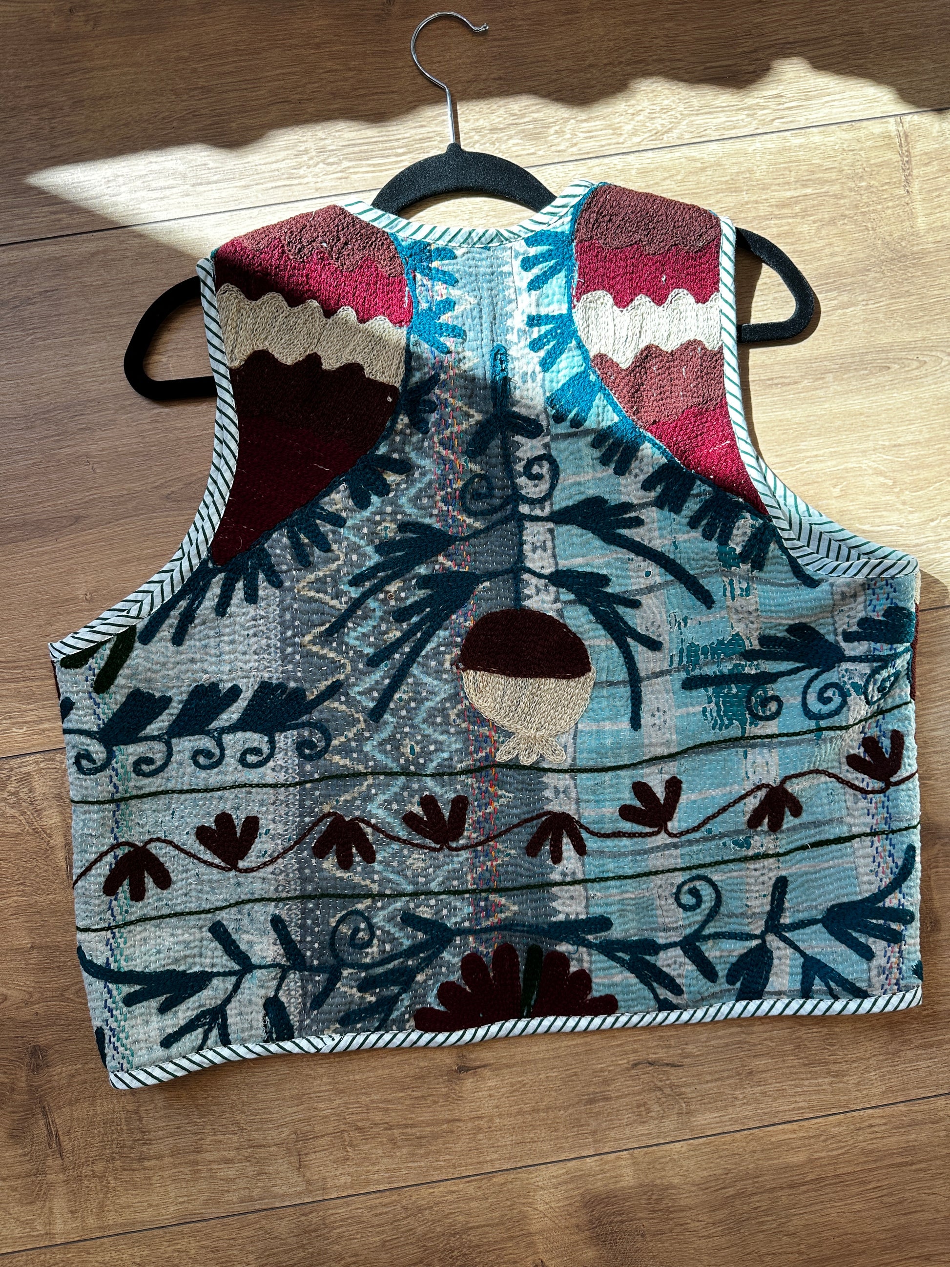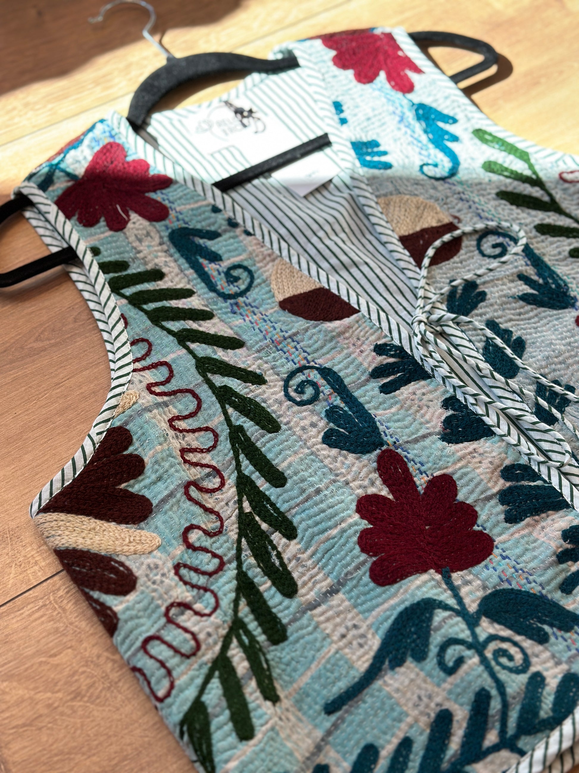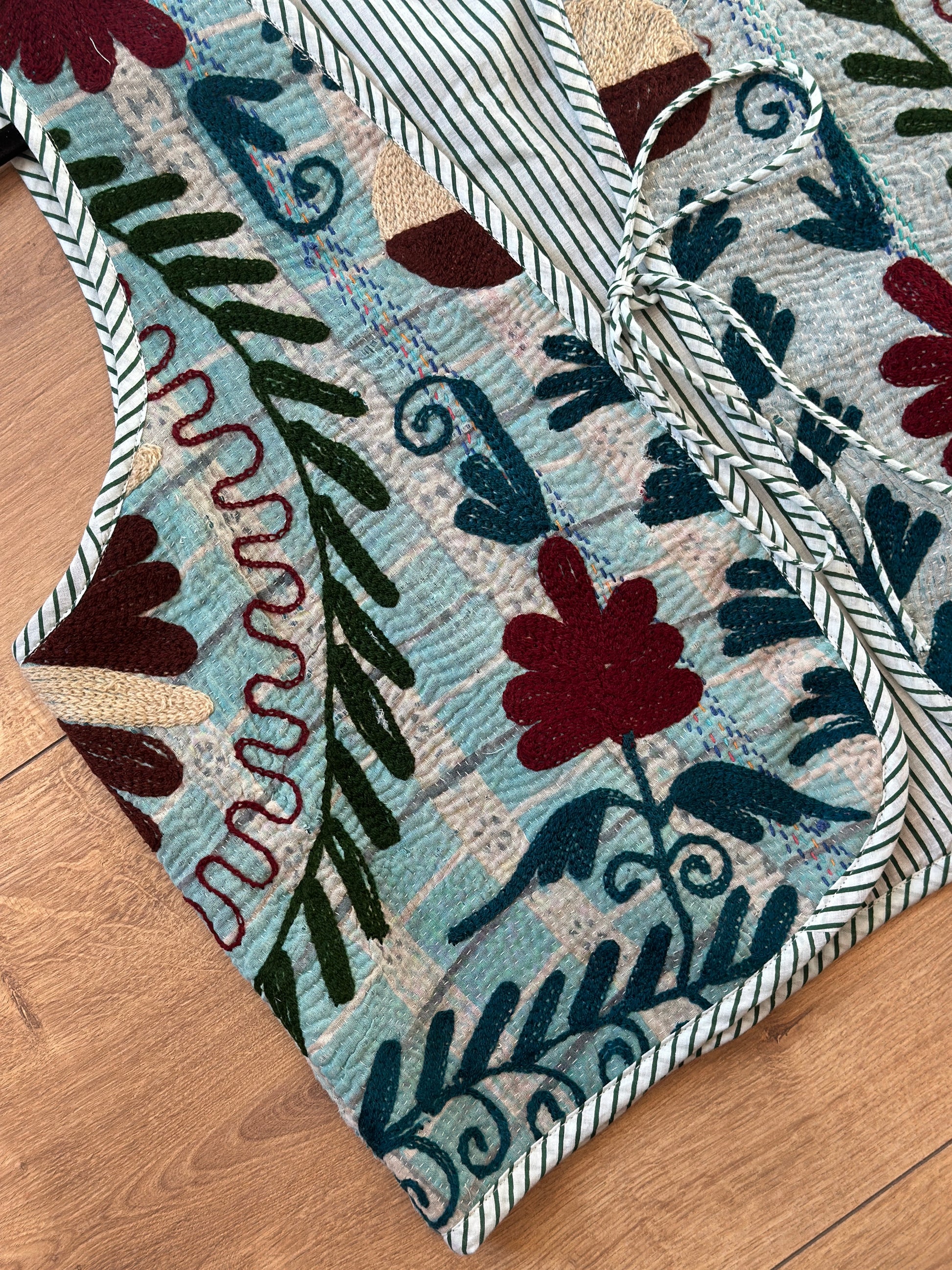 Smuk og unik vest syet af Kantha quilt med de fineste Suzani broderier. Vesten er let vatteret, og perfekt til indendørs brug hele vinterhalvåret - og udendørs i sommeren. Vesten har bindebånd foran og stribet bomuldsfoer.