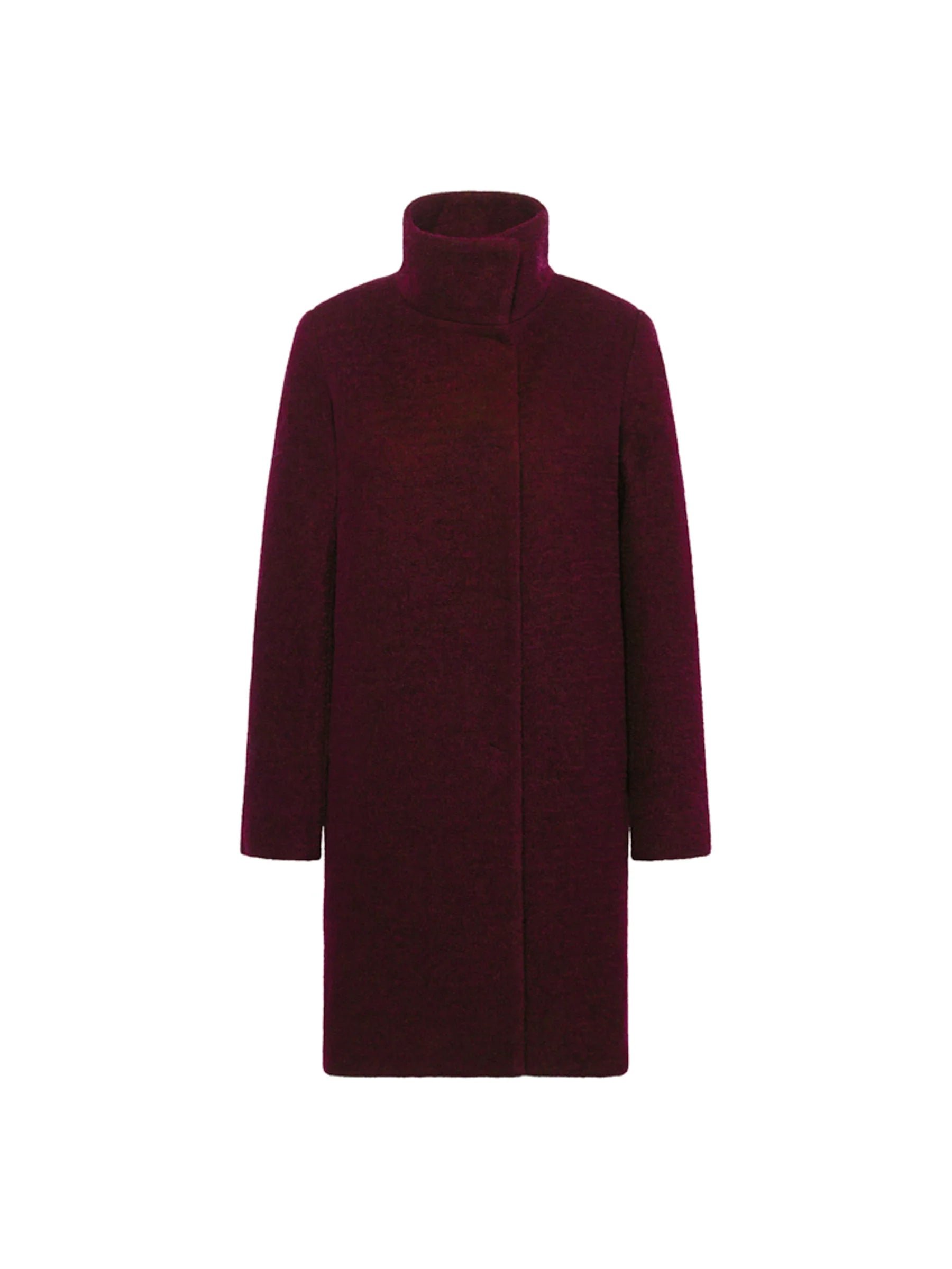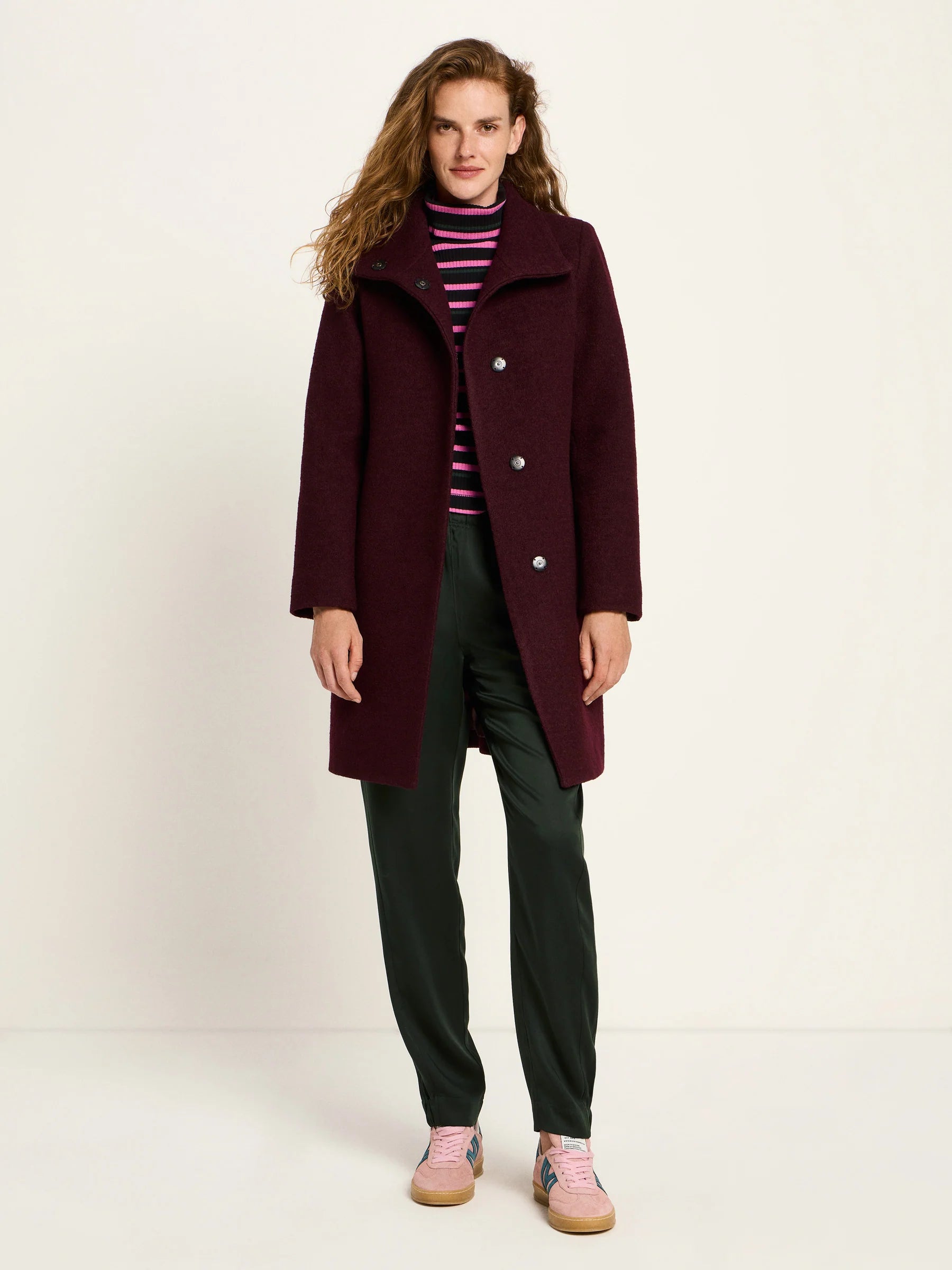 Klassisk og tidsløst design. Jakken er lige op og ned, med opretstående krave, skjult lukning og lommer i hver side. En jakke lavet i blanding af økologisk uld og bomuld, som holder dig varm. Farven er en skøn mørk bordeaux, som giver en varme til outfittet.