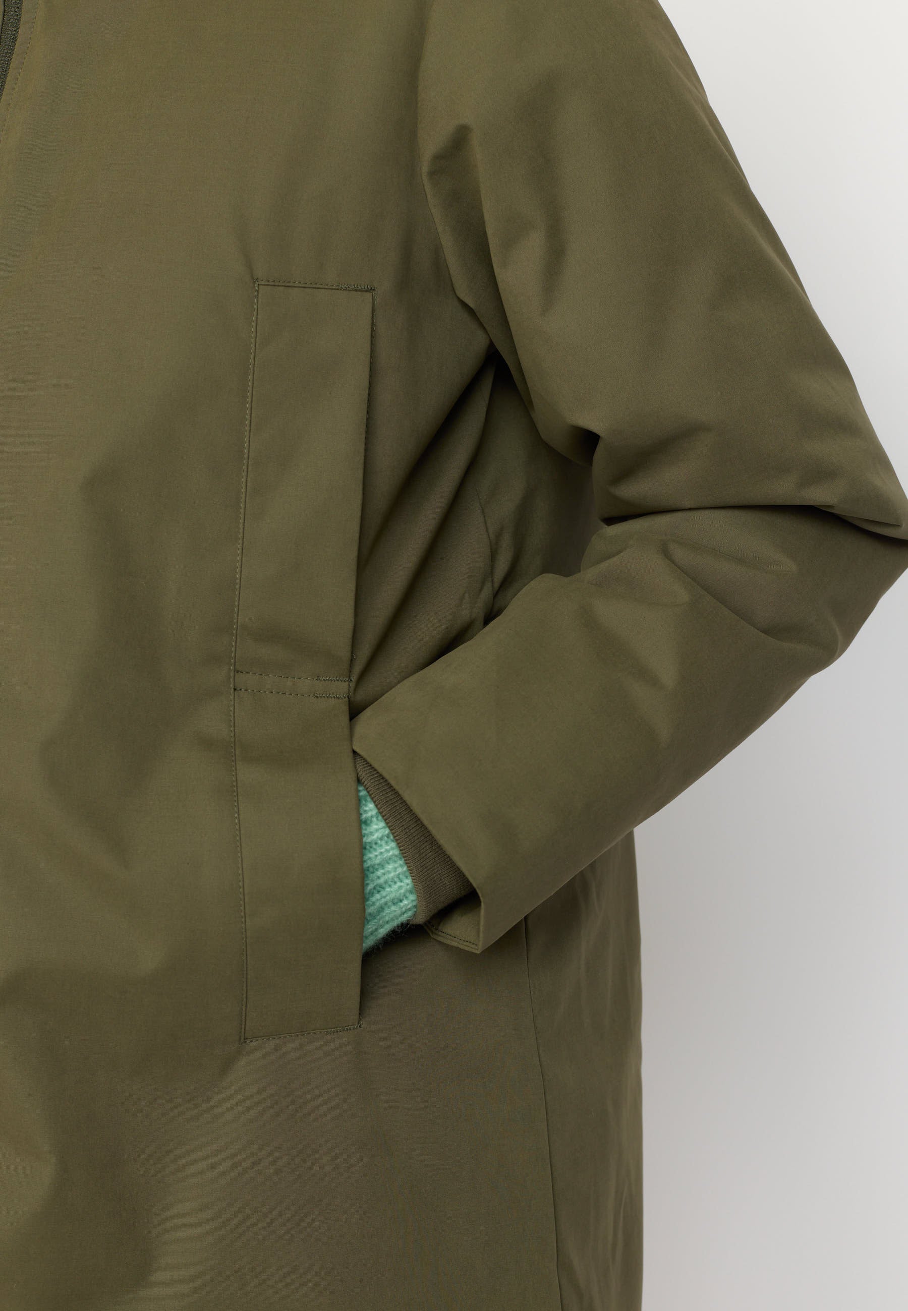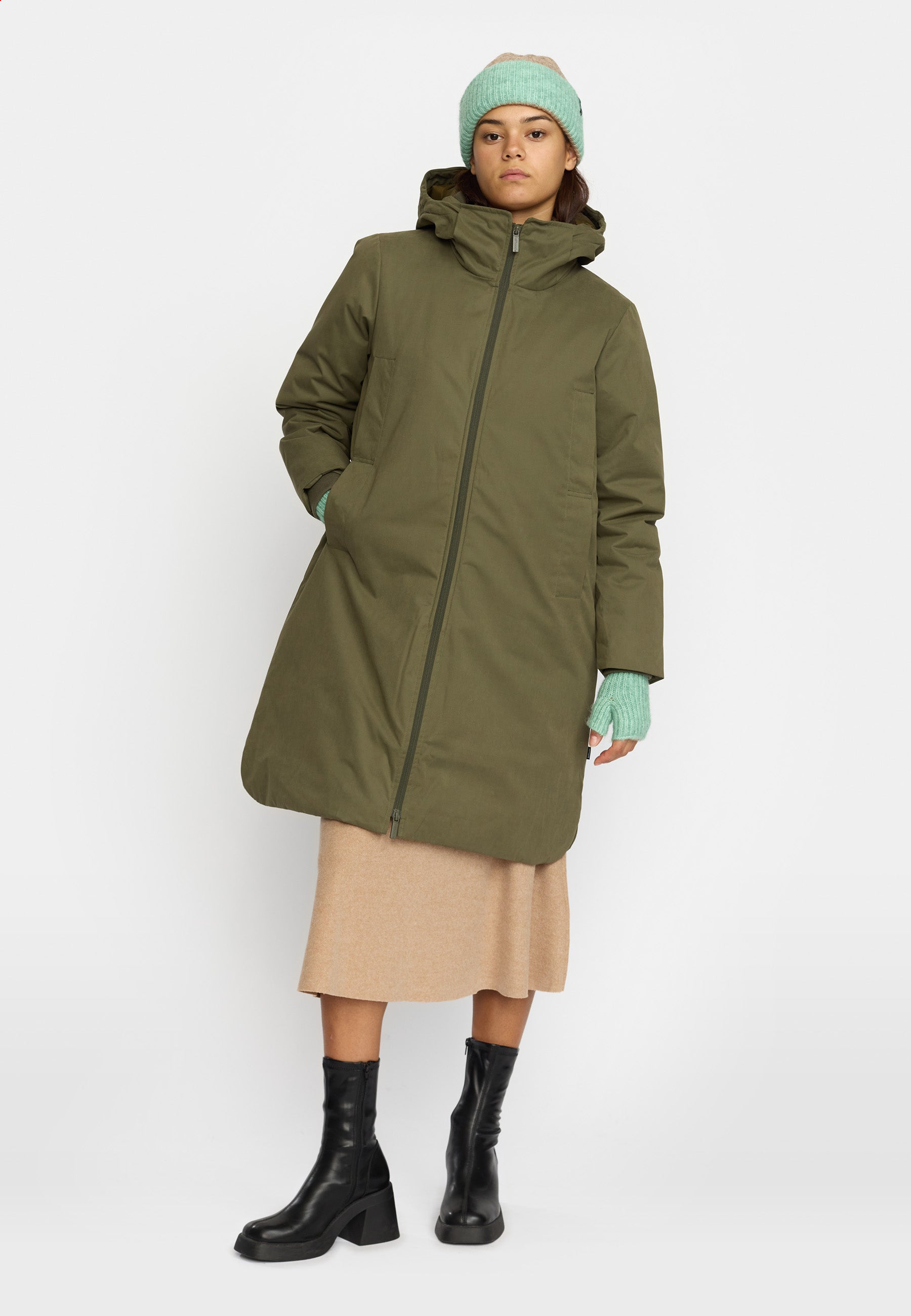 Knælang parkajakke, lavet i en kraftig nylon/bomuldskvalitet med et cool mat look. Modellen har justerbar snøre i taljen, samt i hætten så den kan lukke helt til. Den har skjult ribkant ved ærmet, som holder kold vind ude og så har den de velkendte Selfhood-lommer som er foret med blød fleece - skønt at stikke hænderne i på en kold dag.