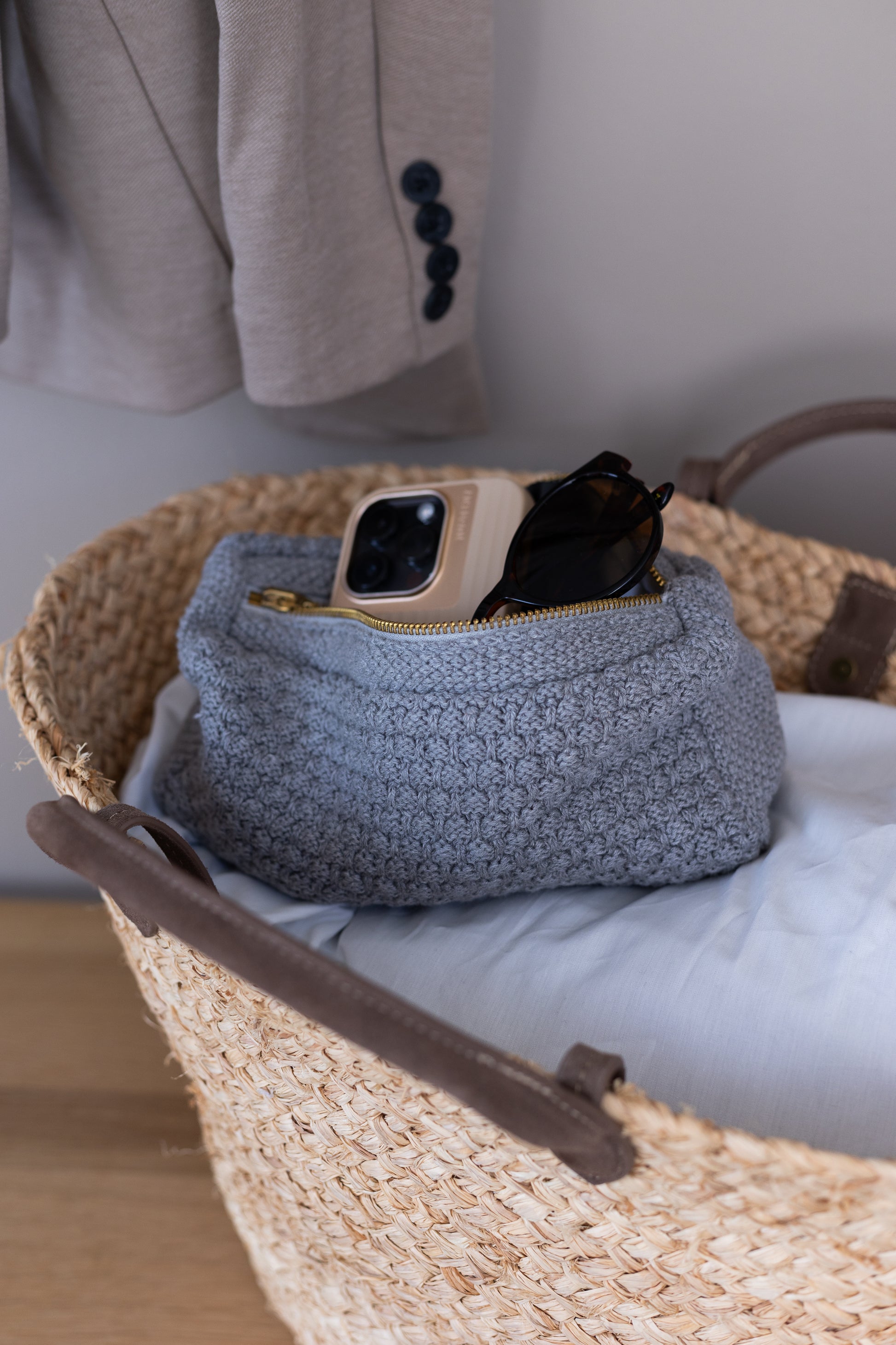 Clutchen er strikket i bomuld i og foret indvendig med ensfarvet bomuld. Clutchen har en lille åben lomme indvendig. Lukkes med lynlås (nikkelfri).