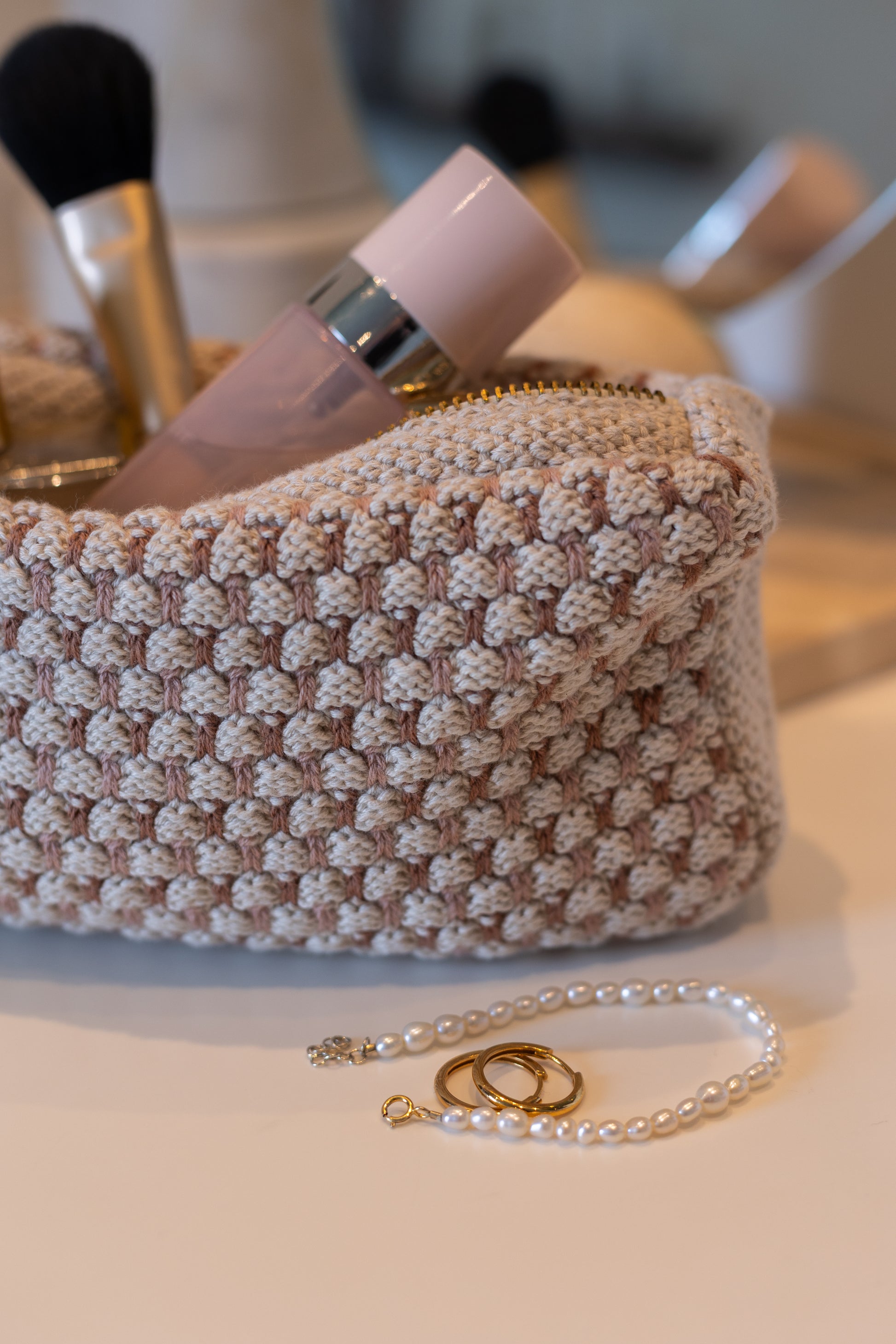 Clutchen er strikket i bomuld i og foret indvendig med ensfarvet bomuld. Clutchen har en lille åben lomme indvendig. Lukkes med lynlås (nikkelfri).