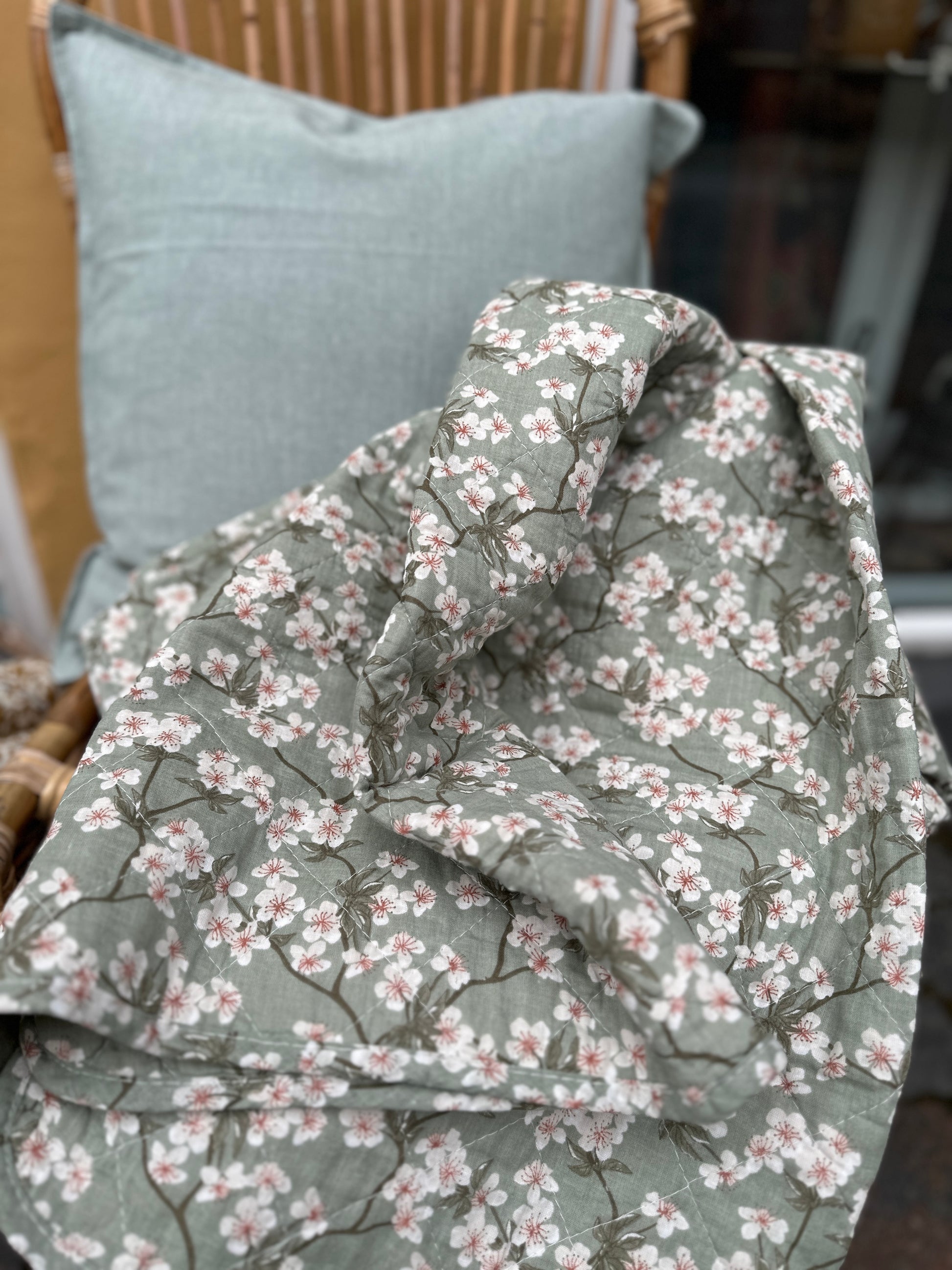 Plaid til sommerens hyggestunder med grøn basefarve og søde lyse sommerblomster. Det quiltede plaid er brugbart både ude og inde, og stort nok som picnictæppe eller til at putte sig i. Kan også bruges som sengetæppe til mindre seng.