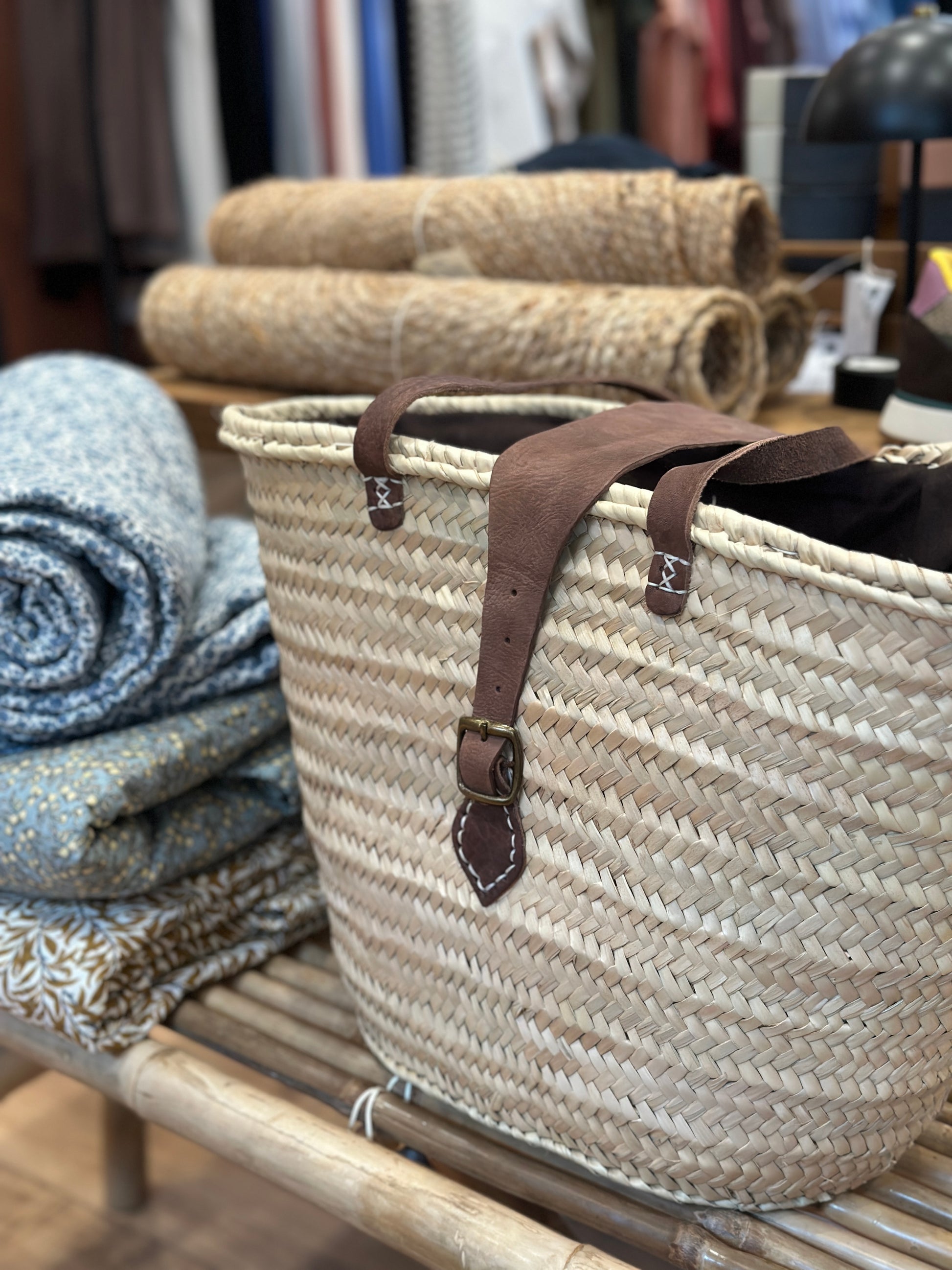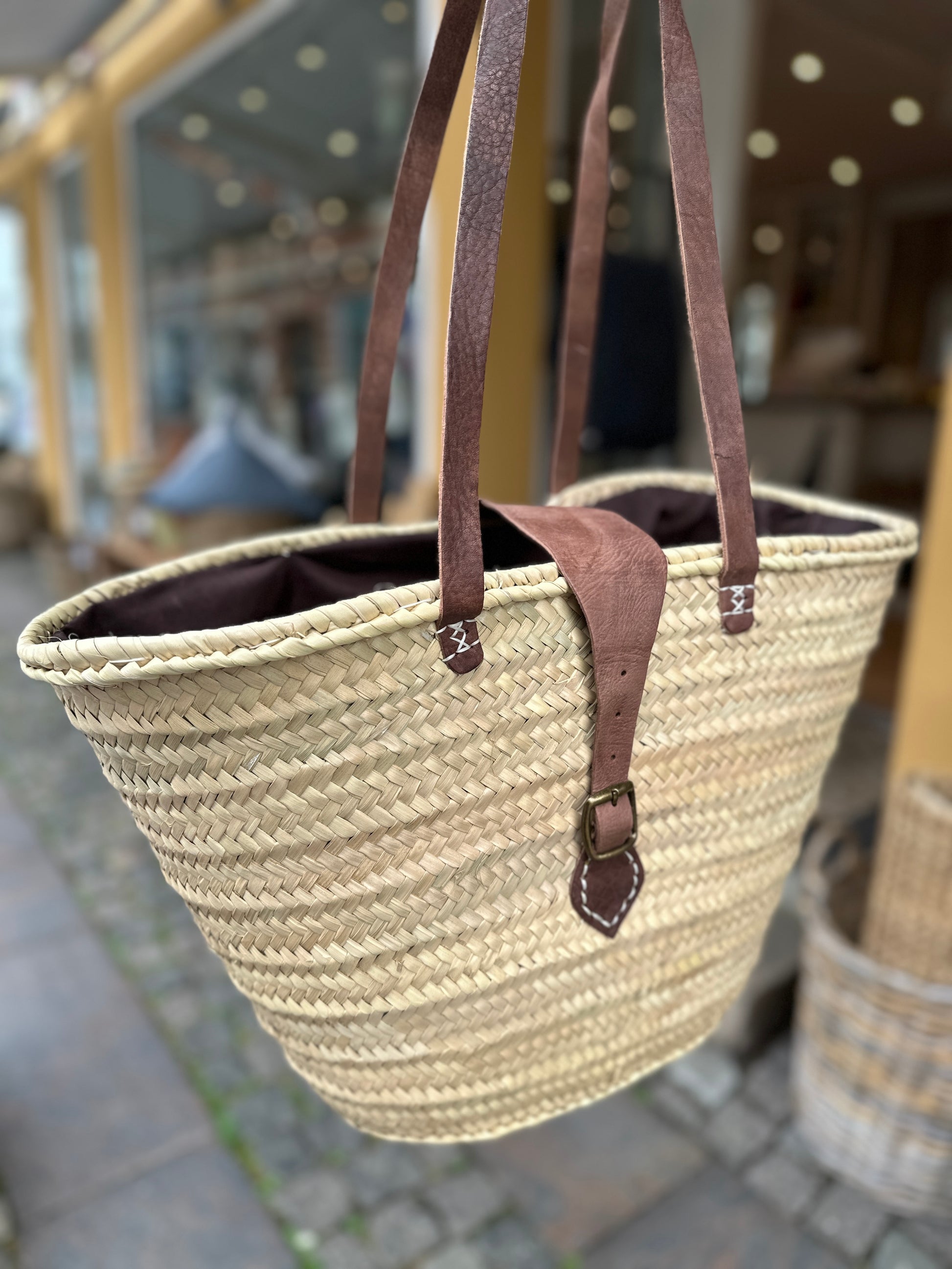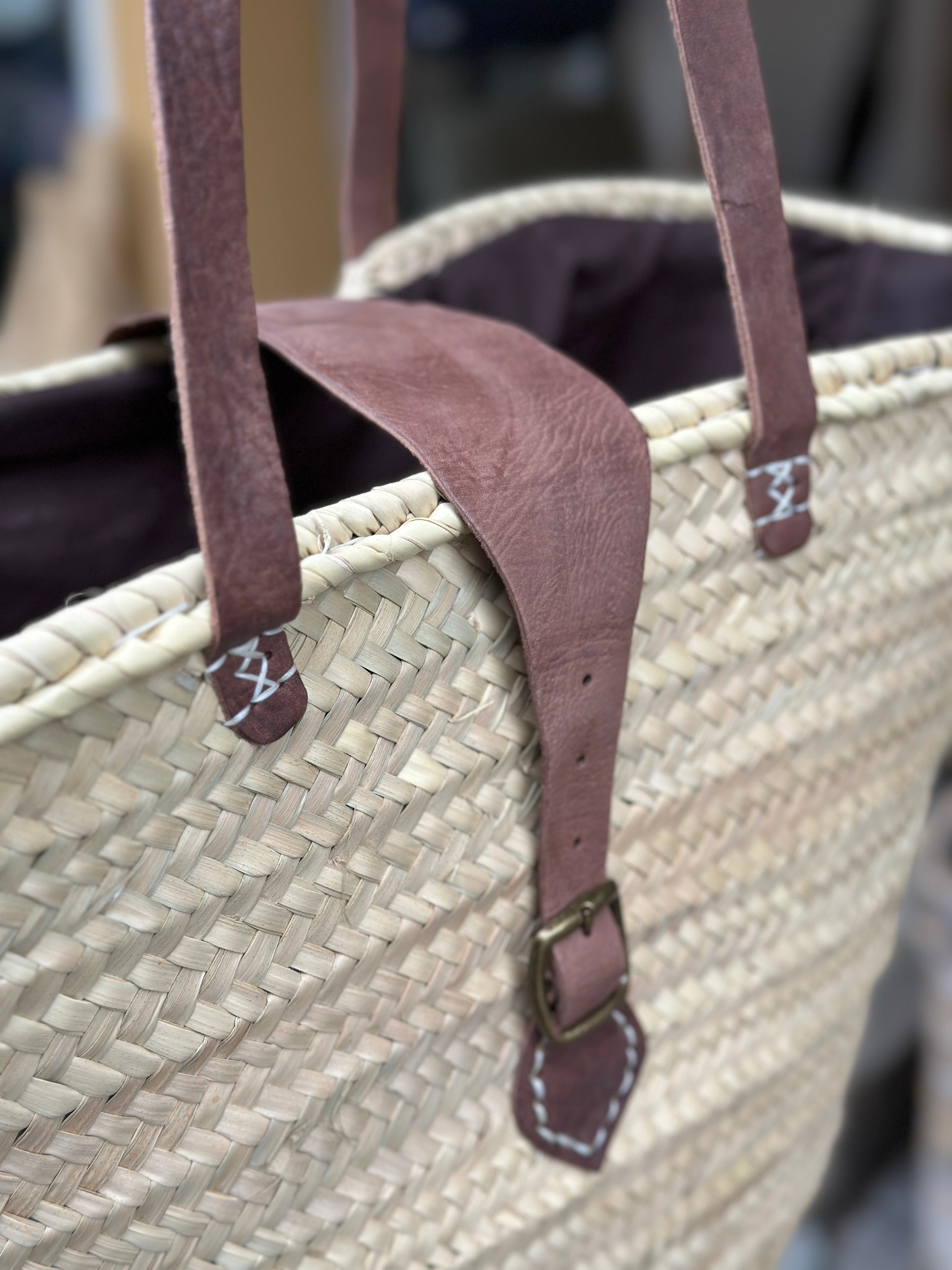 Stor flettaske med læderdetaljer. Lange skulderremme, samt lukning med spænde. Inderstof kan tages op og lukke til.